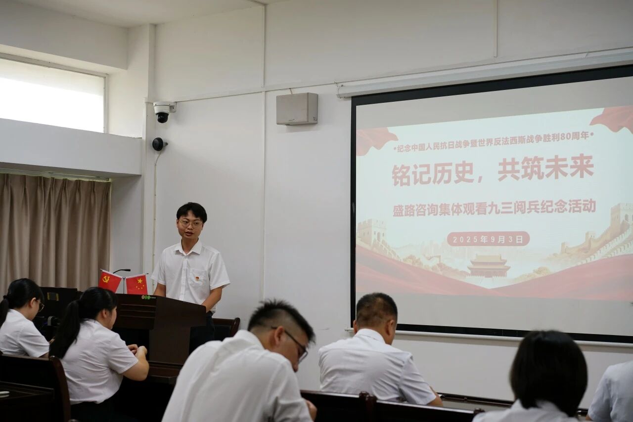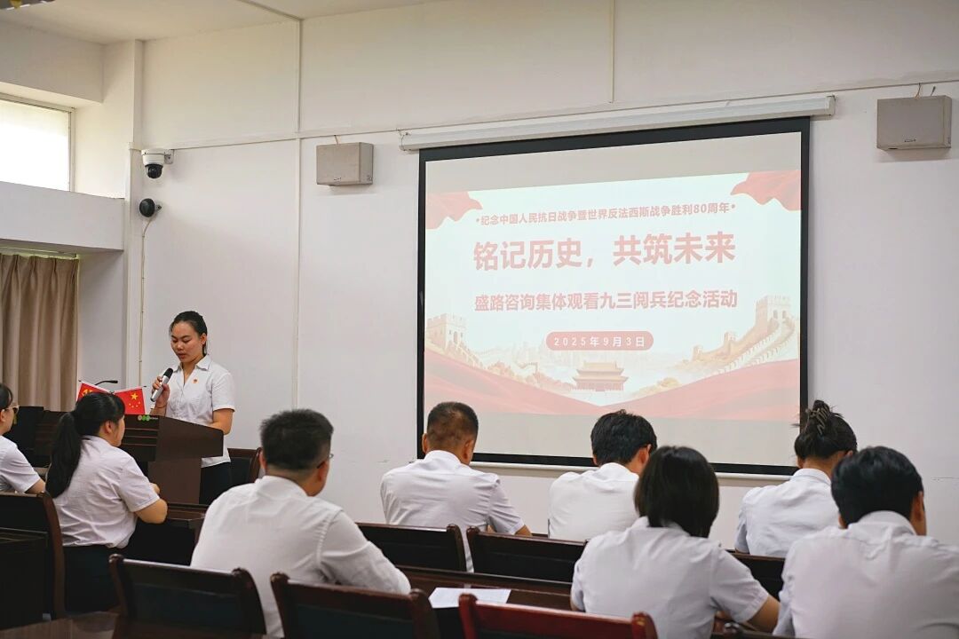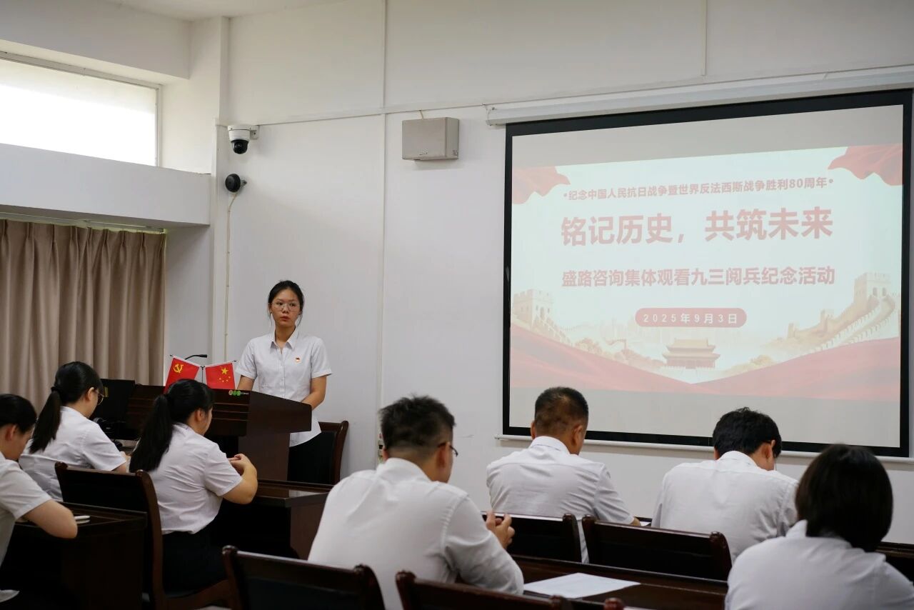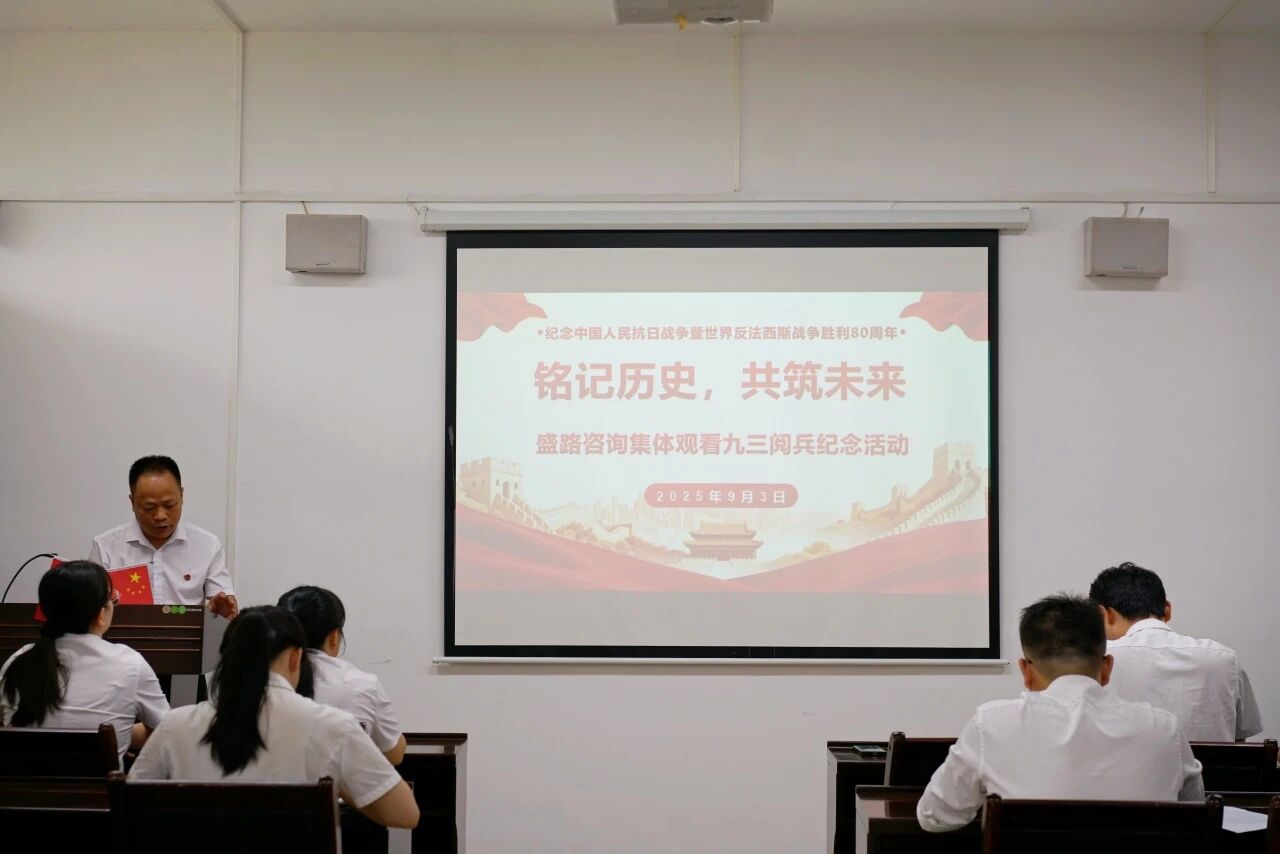 此次集体观看九三阅兵直播活动,不仅是一次爱国主义教育的生动实践,更是盛路咨询以党建为引领,推动企业文化建设的重要举措。未来,公司将继续深化党建工作,激励员工在各自岗位上为实现企业目标、助力国家发展贡献力量 。